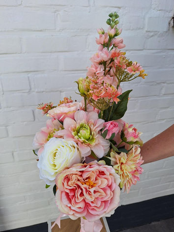 Dit prachtige bruidsboeket straalt elegantie en romantiek uit met zijn zachtroze tinten. Samengesteld uit een harmonieuze mix van bloemen in zachte pasteltinten, waaronder o.a.: pioenroos, dahlia, witte roos, bloesemtak en leeuwenbek.